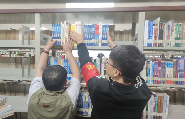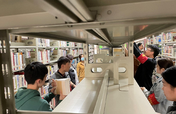 活动开始,图书馆王老师和刘老师介绍了流程和负责内容。在老师的指导和安排下,党员们以长龙的形式对图书馆的旧书进行搬运并分类摆放。整理过程中,党员们积极热情,互相配合,将多余位置的旧书搬运到合适位置,以便于新书存放。经过两个小时的时间,四个立架中的图书全部整理完毕。