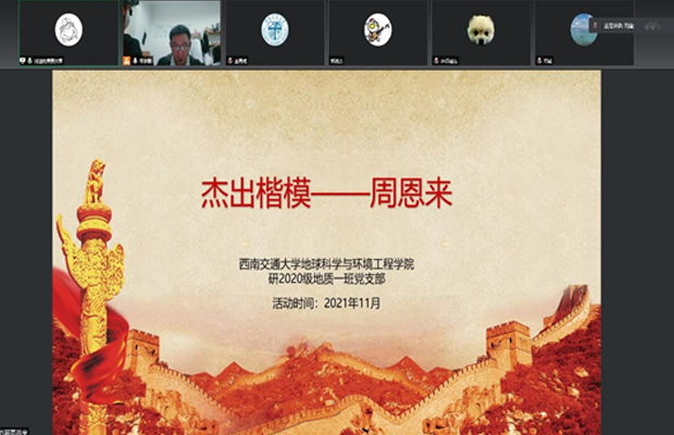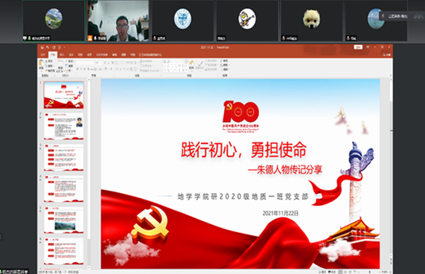 为学习贯彻习近平总书记在庆祝中国共产党成立100周年大会上的重要讲话精神,根据公司党史学习教育工作部署,202111222000,研20级地质一班党支部组织开展线上践行初心,勇担使命主题党日活动,会议由邢本聪同志主持。