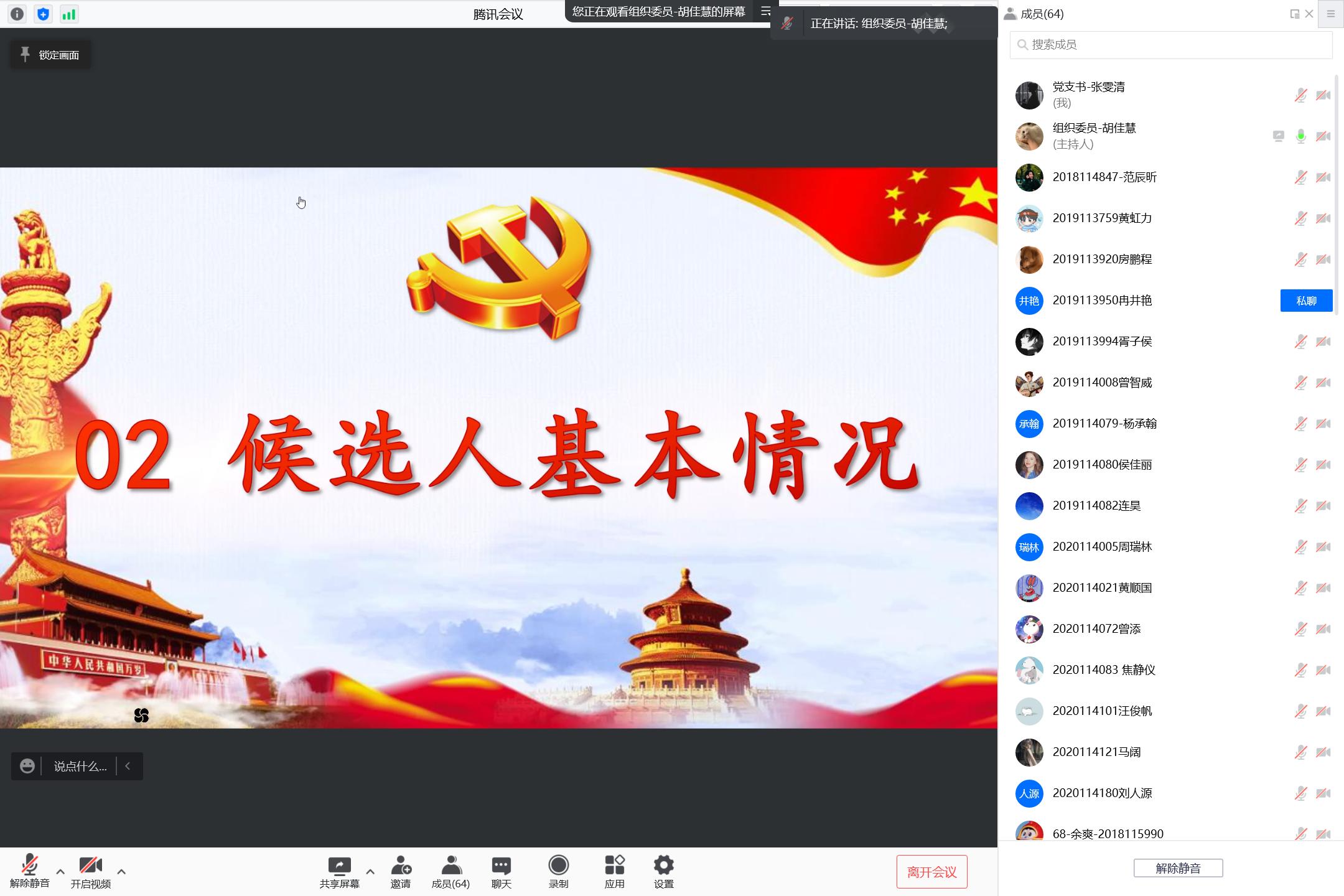 会议第二项,各发展对象候选人的培养联系人、同学、室友以及其他积极分子和党员介绍候选人的基本情况以及就发展对象候选人的思想学习工作生活、个人优缺点发表意见。