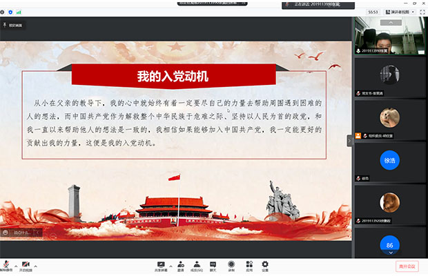 2021年11月20日晚上19点,本科遥感党支部通过腾讯会议线上开展座谈会和发展对象推优答辩。会议主要内容为召集发展对象候选人同学、室友、其他党员和积极分子对候选人表现发表意见,发展对象候选人进行推优入党答辩,支部党员投票确定最终支部的党员发展对象人选。