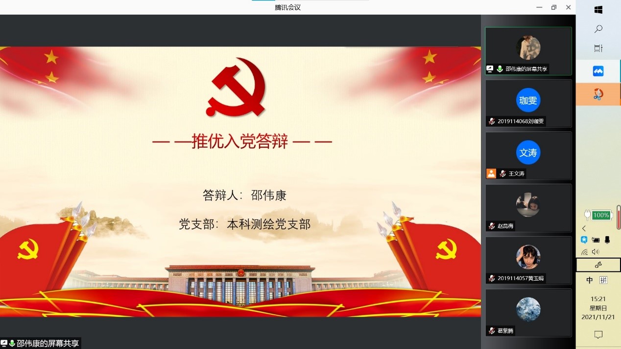 在座谈会结束后,本科测绘党支部于2021年11月21日下午3点于线上开展了发展对象人选“推优入党答辩”大会,本次大会由党支部书记王文涛主持,全体支部成员参加。