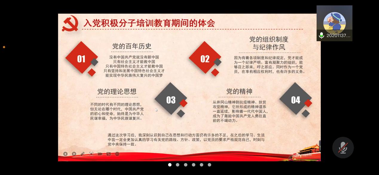 20211120日晚上七点半,本科环境党支部于腾讯会议线上组织开展了推优入党答辩会。本次会议主要是进行2021-04期发展对象选拔工作,由本科环境党支部副书记仁真严木参同志主持,本科环境党支部22名党员、17名入党积极分子参与。