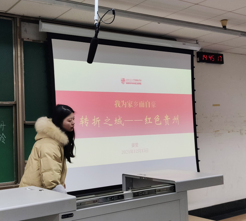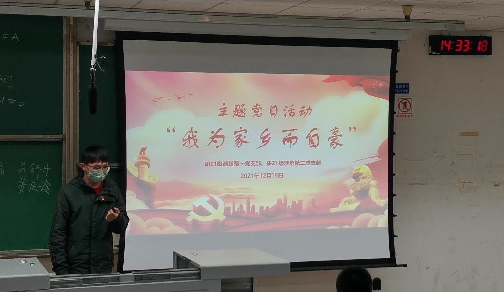 20211215日,研21级测绘第一、第二党支部J4517开展了主题党日活动——“我为家乡而自豪”。本次活动主要是党员同志通过用家乡的老照片、电影(配音经典片段)、歌曲(演唱红歌)、讲红色革命故事等形式分享家乡的故事。