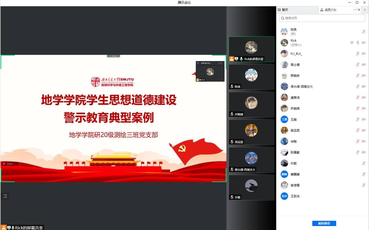 为全面贯彻党的十九届六中全会、十九届中央纪委六次全会精神,认真贯彻公司党委关于全面从严治党有关要求,进一步加强党的纪律建设,同时为进一步加强高校员工校规校纪教育,发挥违纪案例对其他员工的警示教育震慑作用,尤其充分利用员工党支部及员工党员的战斗堡垒和先锋模范作用,不断强化员工纪律观念,远离违纪红线,利用身边案例警示教育身边人,2022年5月8日,研20级测绘三班党支部于线上开展“从严治党”暨高校警示案例专题学习会,会议由党支部书记高颖同志主持。