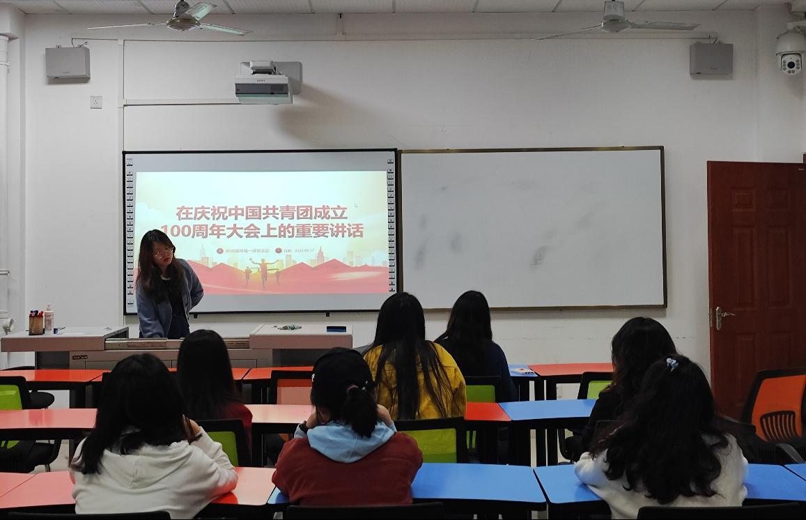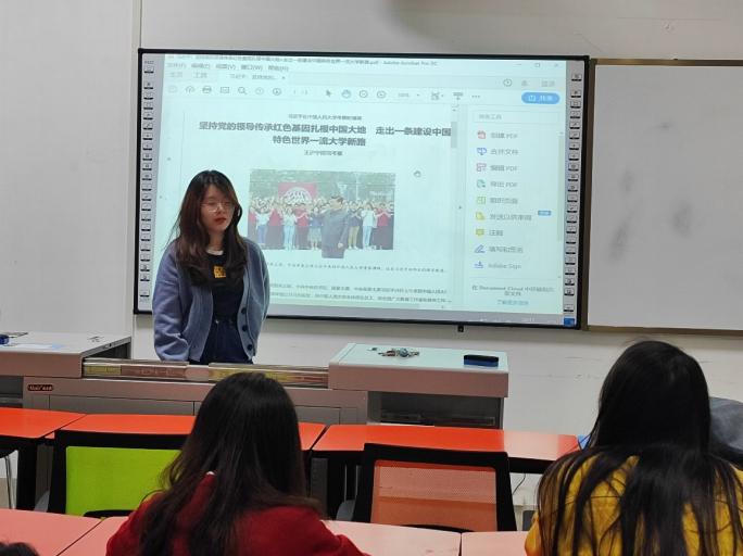 紧接着李佳琪带领大家学习了习近平总书记在中国人民大学考察时的重要讲话精神。在五四青年节即将到来之际,习近平总书记专程到中国人民大学考察调研。习近平强调,“为谁培养人、培养什么人、怎样培养人”始终是教育的根本问题。要坚持党的领导,坚持马克思主义指导地位,坚持为党和人民事业服务,落实立德树人根本任务,传承红色基因,扎根中国大地办大学,走出一条建设中国特色、世界一流大学的新路。