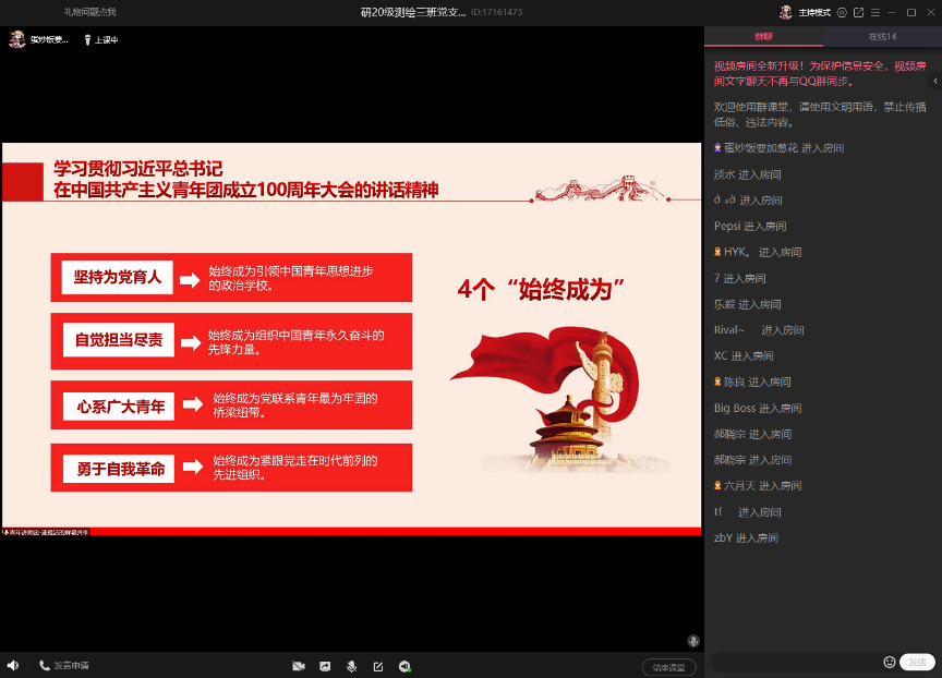 4月25日,在五四青年节即将到来之际,中共中央总书记、国家主席、中央军委主席习近平到中国人民大学考察调研,与师生代表面对面交流谈心,并发表了重要讲话。5月10日,习近平总书记出席庆祝中国共产主义青年团成立100周年大会,并发表了重要讲话。在公司党委的指示下,2022年5月24日晚八点,研20级测绘三班党支部于线上开展了相关学习活动。本次学习活动由支部逄雅洁同志领学。