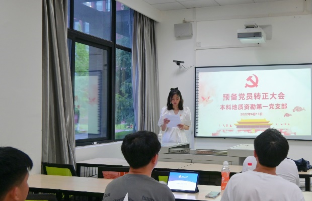 2022年6月13日星期一晚19:00,本科地质资勘第一党支部于X4132开展“预备党员转正大会”。本次会议由党支部书记黄丽敏同志主持,本科地质资勘第一党支部全体正式党员参加,有表决权的正式党员实到会人数超过应到会人数的一半,符合组织规定,大会有效。本次会议的主题是讨论关于曹儒博、刘刚、李洋、葛晓艳、周靖泰、吴有泰等6名预备党员的转正问题,大会严格按照组织规定的预备党员转正大会的各项会议流程进行。