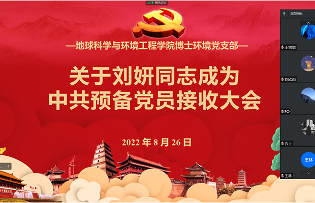2022826日下午1600分,地学博士环境党支部在X4520教室召开预备党员接收大会。大会就发展对象刘妍同志接收为预备党员问题进行讨论。会议由党支部书记闵雪峰同志主持,支部党员及积极分子出席会议。会议通过线上与线下结合方式进行。