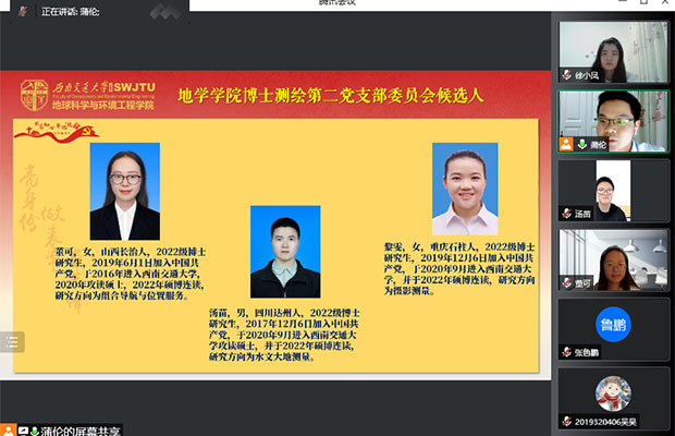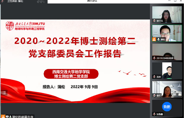 2022年9月9日晚19:30,BEATS博士测绘第二党支部通过腾讯会议(ID:362 429 194)召开了支部委员换届选举大会,会议由支部书记蒲伦主持,支部全体成员参加。