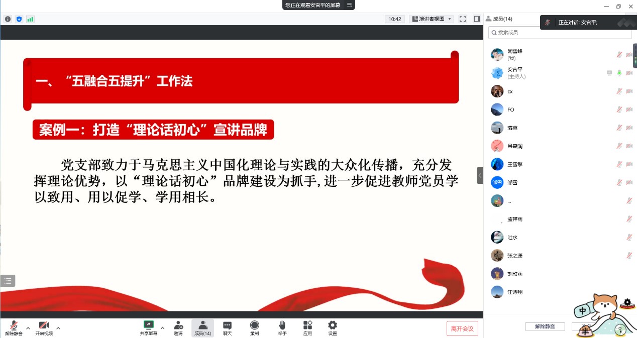 最后,支部书记安官平同志带领支部党员及积极分子,针对习近平总书记指出的“党支部是分布在教研室、实验室、教学科研团队、员工班级中的‘火车头’,也是党联系和团结师生、做思想政治工作的组织依托。要抓在经常、严在平时。”进行了讨论,鼓励党员同志会后继续学习《四川省高校“优秀支部工作法”》,为支部的党建工作贡献自己一份力。