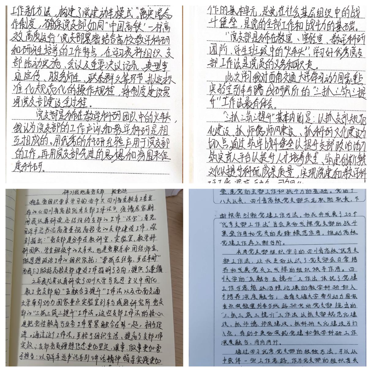 本次活动主要结合《四川省高校“优秀支部工作法》,通过共享学习资料的形式,号召全体支部党员参与到此次学习活动中,并且为了保证学习成果的多样性,我们共采取了word手打、笔记本手写、以及绘制思维导图等三种记录心得体会的方式,确保每位党员同志通过学习此类学习秘籍,能够将自身的所思所想所悟最大程度的记录下来。之所以开展这项学习工作,我支部也有以下考虑:员工党支部不仅是党组织的基础,更是员工班级中的火车头,在高校的支部建设工作中有着不可替代的作用,那么作为党支部成员的我们每一个人,都有责任和义务去为党建工作而服务,共同发挥党员先锋的模范作用,才能更有力的体现出党支部的战斗堡垒作用,所以学习优秀党支部的方法及经验,是我们每位员工党员的必修课程之一,通过这类学习活动,也能尽可能的激发党员内在动力和支部活力。