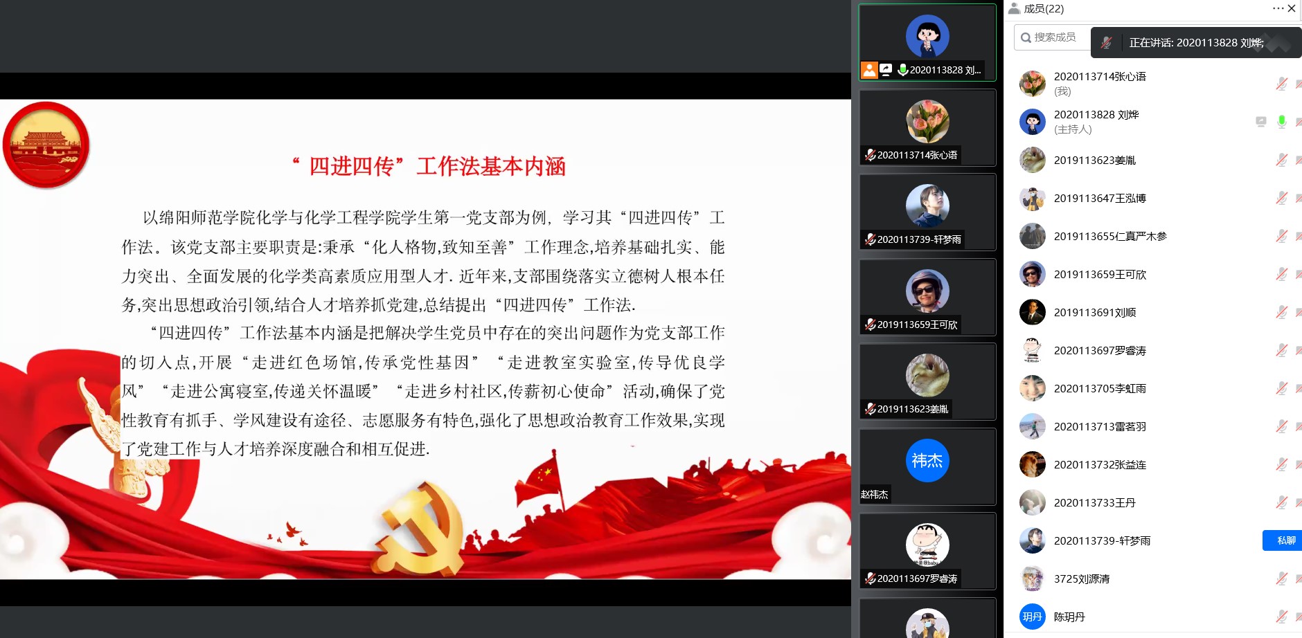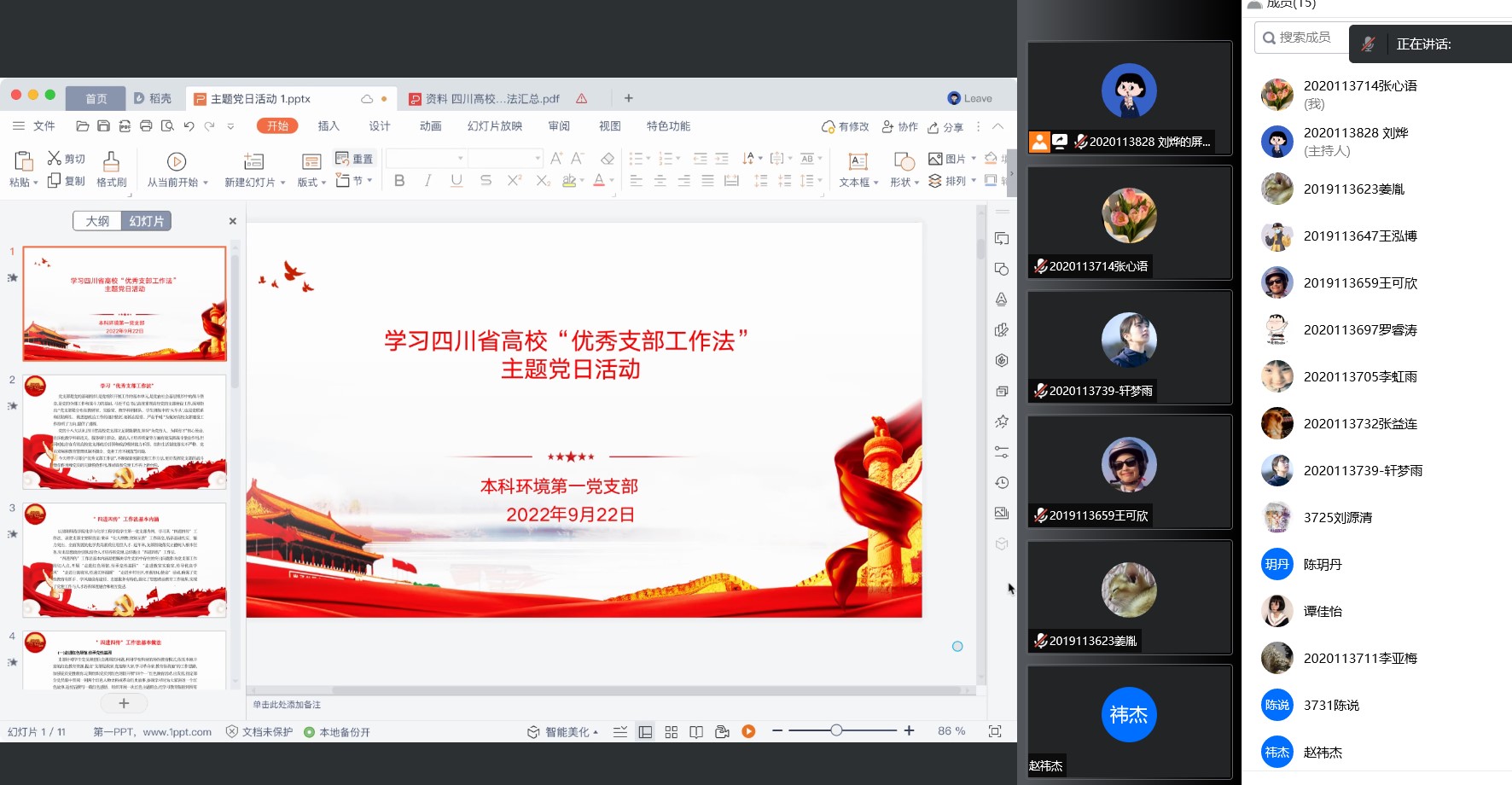 022年9月22日晚7点30分,本科环境第一党支部线上开展了学习四川省高校“优秀支部工作法”主题党日活动,本次活动由支部书记刘烨同志主持,本科环境第一党支部全体党员参与。