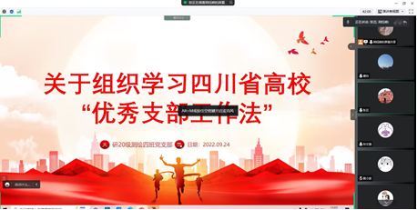 2022年9月24日12:45,研20级测绘第四党支部开展四川省高校“优秀支部工作法”活动。党的十八大以来,四川省高公司党支部立足职能职责,坚持“为党育人、为国育才”初心使命,在深化教学科研攻关、服务师生群众、提高人才培养质量等方面有效发挥战斗堡垒作用,但同时也存在有的高公司党支部政治引领和政治吸纳能力不强、组织生活制度落实不严格、党员发展和教育管理机制不健全、党务工作不规范等问题针对这些问题,技照“可学习、可借鉴、可复制、可推广”的原则,择优确定了20个“优秀支部工作法”。