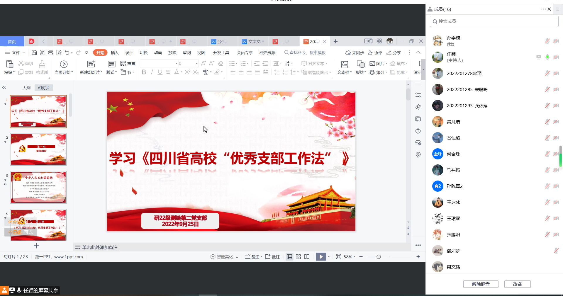 为了能够更好地深入学习《四川省高校“优秀支部工作法”》重要内容,领会《四川省高校“优秀支部工作法”》中的重要精神,理解《四川省高校“优秀支部工作法”》的重要意义,2022年9月25日,BEATS研22级第二党支部于线上开展了2022年度9月份以“深入学习《四川省高校“优秀支部工作法”》重要内容”为主题的党组织生活会和专题学习,组织全体党员学习《四川省高校“优秀支部工作法”》。参会人员主要包括BEATS研22级第二党支部全体党员同志。此次活动旨在让党员同志们通过学习四川省各个高校的优秀支部工作方法,探索创新党建工作方法,更好发挥党支部的战斗堡垒作用和党员的先锋模范作用,推动支部党建工作再上新台阶。会议由党支部书记任颖同志主持。