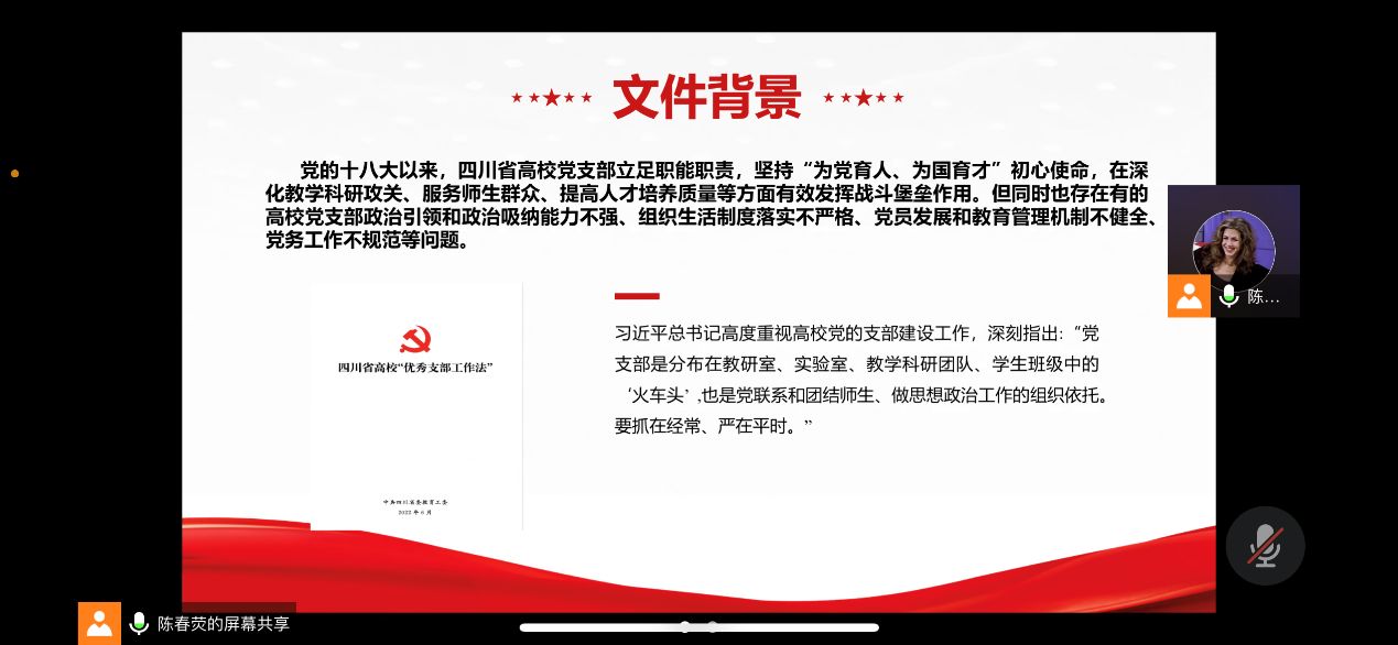 会议开始,党支部书记陈春荧向参会党员介绍了《四川省高校“优秀支部工作法”》文件背景。党的十八大以来,四川省高公司党支部立足职能职责,坚持“为党育人、为国育才”初心使命,在深化教学科研攻关、服务师生群众、提高人才培养质量等方面有效发挥战斗堡垒作用。但同时也存在有的高公司党支部政治引领和政治吸纳能力不强、组织生活制度落实不严格、党员发展和教育管理机制不健全、党务工作不规范等问题。针对这些问题,2021年9月,省委教育工委开展“优秀支部工作法”推荐评选活动,共遴选推荐205个“支部工作法”。按照“可学习、可借鉴、可复制、可推广”的原则,确定了20个“优秀支部工作法”。