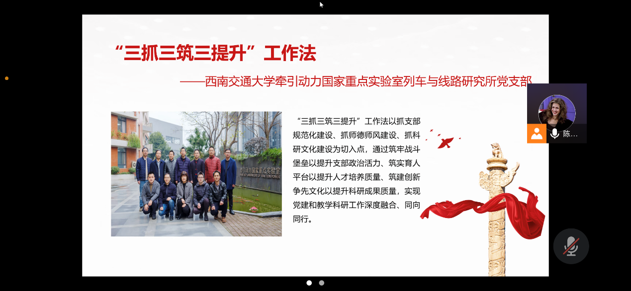随后,支部书记陈春荧带领参会党员一起学习了四川大学马克思主义公司马克思主义中国化教工党支部的“五融合五提升”工作法、电子科技大学格拉斯哥公司教工党支部的“联学 联建 联动”工作法以及BEATS牵引动力国家重点实验室列车与线路研究所党支部的“三抓三筑三提升”工作法,学习内容主要为“优秀支部工作法”的基本内涵、主要做法、工作启示以及具体案例。