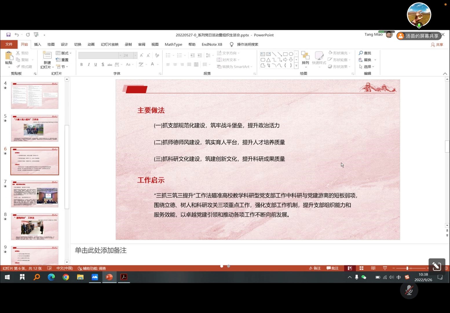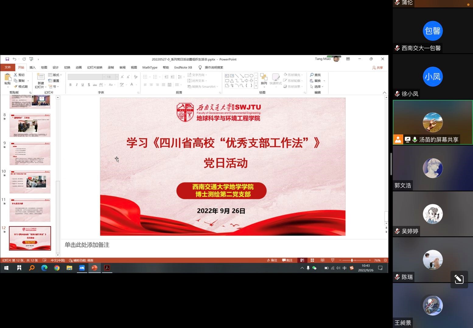 中共四川省委教育工委于2021年9月开展了“优秀支部工作法”推荐评选活动,按照“可学习、可借鉴、可复制、可推广”的原则,择优确定了20个“优秀支部工作法”。为深化支部成员对高公司党建工作的认识和理解,更好地建设党支部,2022年9月26日上午10:30,BEATS博士测绘第二党支部通过腾讯会议(会议ID:851 499 666)在线上开展了学习《四川省高校“优秀支部工作法”》专题党日活动。会议由支部书记汤苗主持,支部全体成员参加。