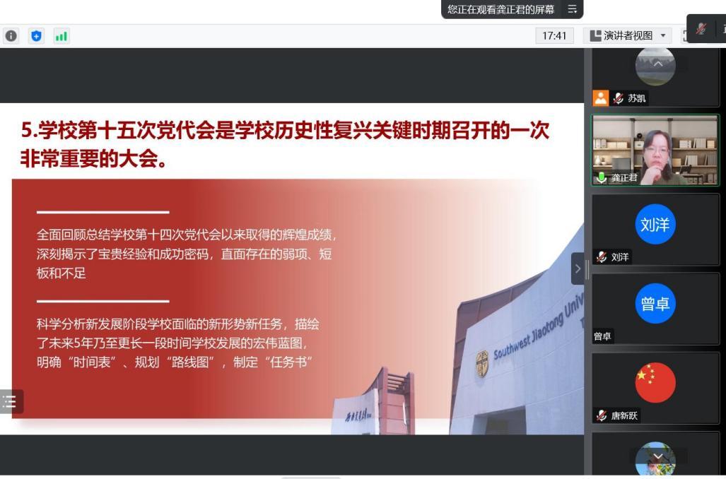龚正君同志从公司第十五次党代会基本情况,公司第十五次党代会主要精神,公司纪委工作报告主要内容等方面深刻解读了党代会精神。此次大会的主题是: 高举习近平新时代中国特色社会主义思想伟大旗帜,深入贯彻落实习近平总书记关于教育的重要论述,全面总结成绩与不足,把握公司现阶段面临的主要矛盾,明确公司新时代的办学思路、发展目标、基本准则、实现途径,统一思想,凝聚共识,振奋精神,不断谱写中华民族伟大复兴的西南交大新篇章。