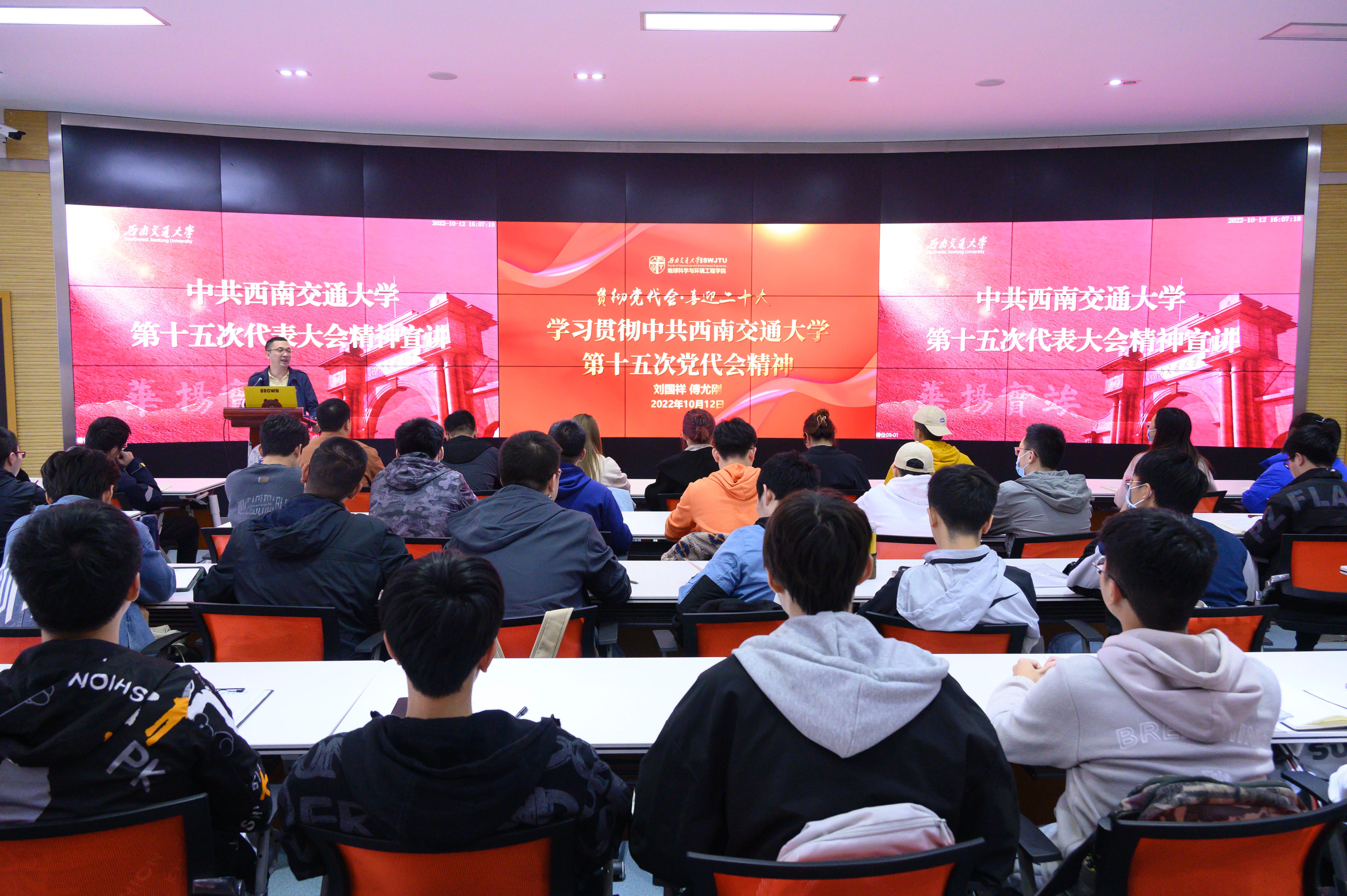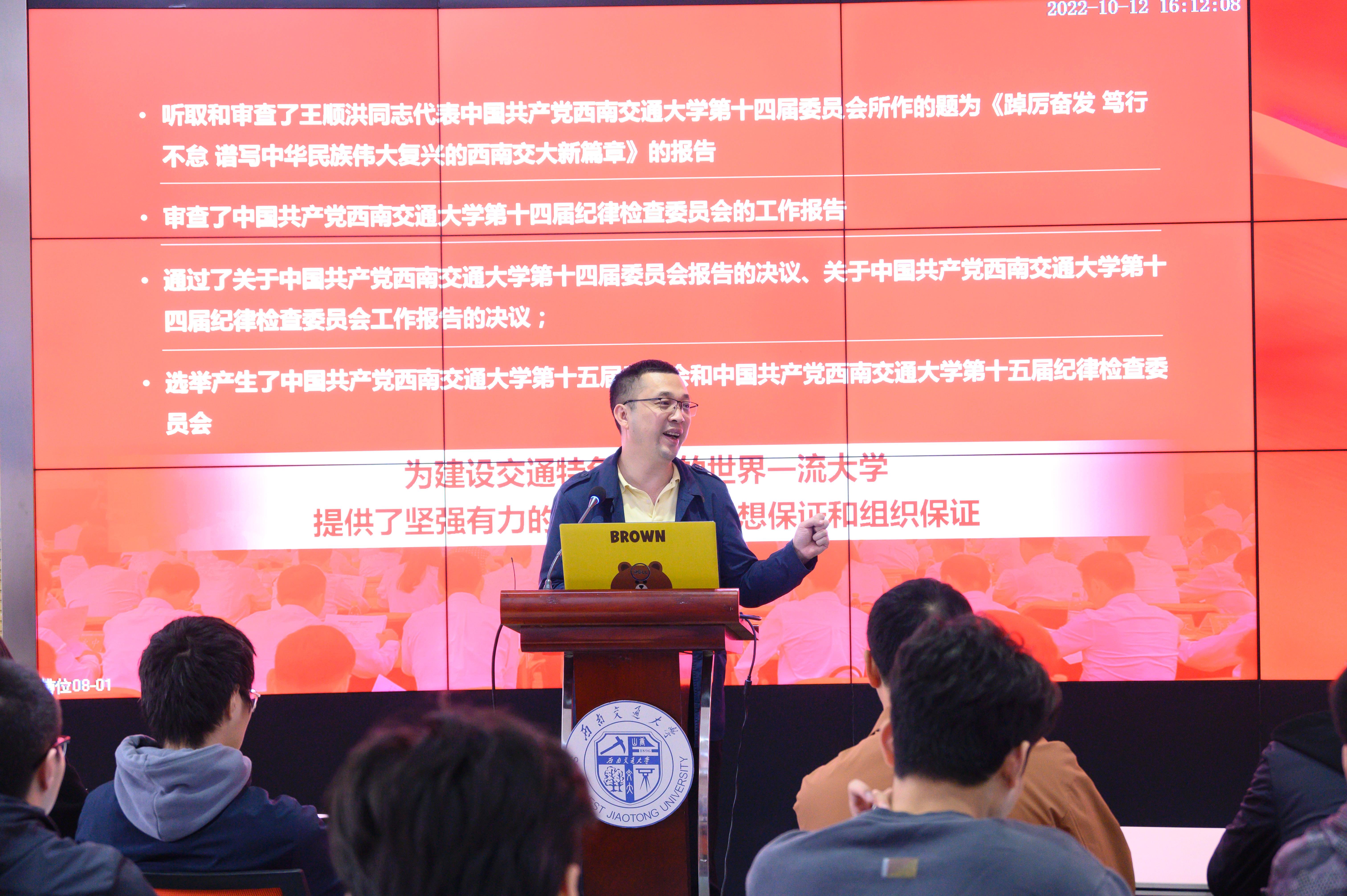 随后,傅尤刚书记讲解报告核心内容并结合同志们生活学习实际传达BEATS第十五次党代会主要精神。报告系统回答了“新时代建设什么样的西南交大以及怎样建设”这一重大问题,为公司的快速高质量发展指明了方向、谋定了目标、明确了路径。针对建设交通特色鲜明的世界一流大学的总目标,傅书记就公司交通运输工程学科以及交大其他重点学科展开介绍,帮助同志们进一步了解交大。