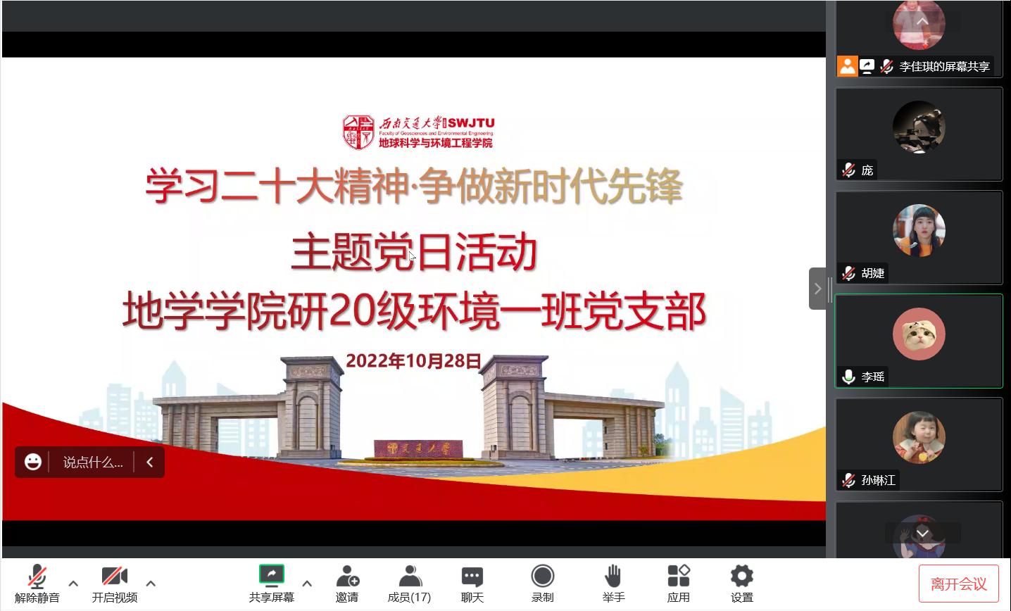 2022年10月28日星期五晚上八点,研20级环境一班党支部于腾讯会议开展“学习二十大精神·争做新时代先锋”主题党日活动,主要内容为:认真学习习近平总书记在中国共产党第二十次全国代表大会上的重要讲话精神。本次会议由研20级环境一班党支部书记李佳琪主持,研20级环境一班党支部全体党员参加。