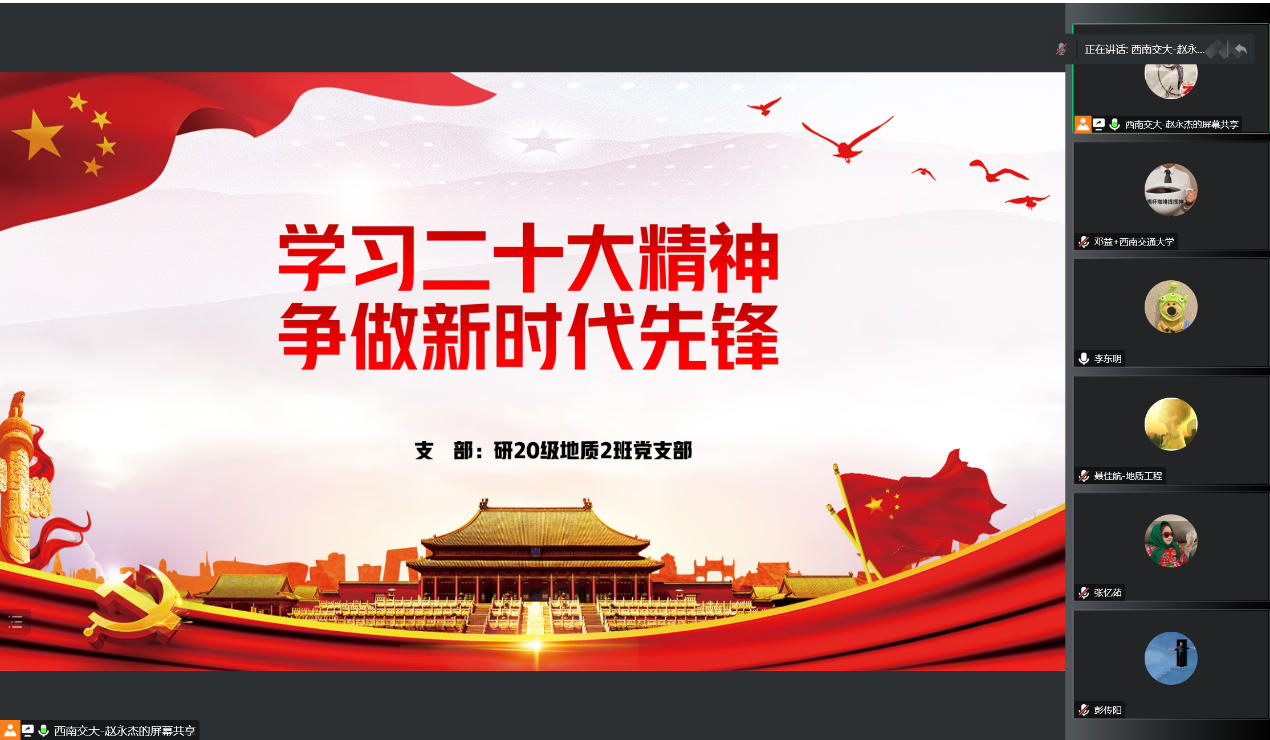 为深入学习宣传贯彻党的二十大精神,把支部党员的思想认识统一到党的二十大精神上来,BEATS研20级地质2班党支部于10月31日晚举办开展了“学习二十大精神,争做新时代先锋”的主题党日活动,由赵永杰同志主持。