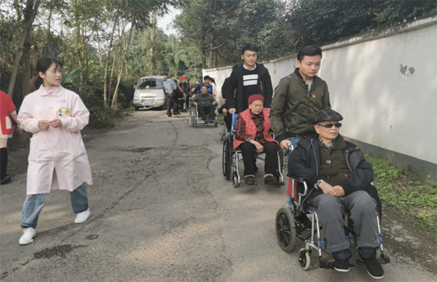 活动第二个部分,志愿者们和养老院的护工们一起陪着老人们去往附近的湿地公园散心,大家或推着老人们的轮椅或搀扶着老人行走,沿着锦江旁的人行小道慢慢地行走着,陪他们放松心情,陪他们感受这冬日里美好的阳光,看着湛蓝的天空,明媚的阳光和潺潺的河流,老人们都露出了喜悦的笑容。