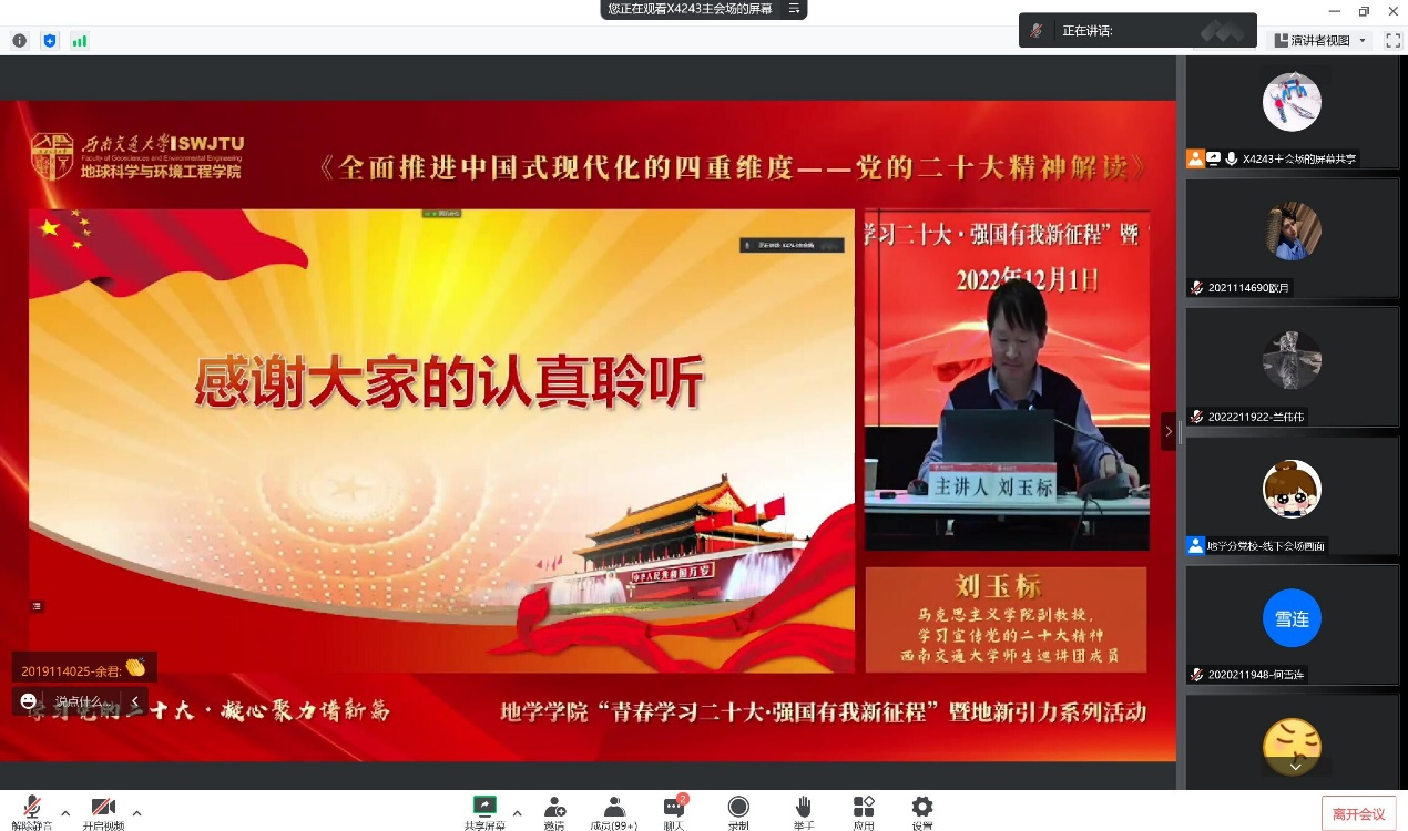 为深入学习贯彻党的二十大精神,号召全体党员用党的二十大精神武装头脑。12月1日下午16:00点整,BEATS在X4243会议室以线下、线上,集中和个人自行收看相结合的方式开展“党的二十大精神专题宣讲”活动。本次讲座由BEATS马克思主义公司副教授、BEATS党的二十大精神师生巡讲团成员刘玉标主讲,BEATS专职组织员、党务秘书李晓宇主持,院内员工党员、发展对象、入党积极分子、青年讲师团成员代表共计800余人参加。