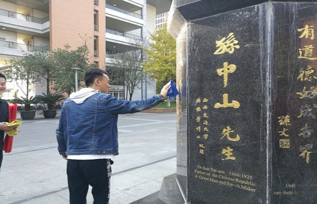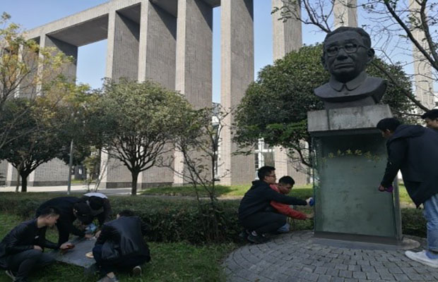 下午2点半,两个支部的党员纷纷带上清洁工具在交大的“俟实扬华”牌匾处集合,校园内的纪念雕塑甚多,于是两个支部的党员分头行动。首先我们来到了孙中山先生的纪念雕塑前,底座上刻着先生语录“有道德始有国家,有道德始成世界”。孙中山先生是中国近代民族民主主义革命的开拓者,中国民主革命伟大先行者,早在中国还在艰难寻找和探索现代化道路时期,孙中山先生就将道德建设放置在了国家进步和世界发展的基础性位置。
