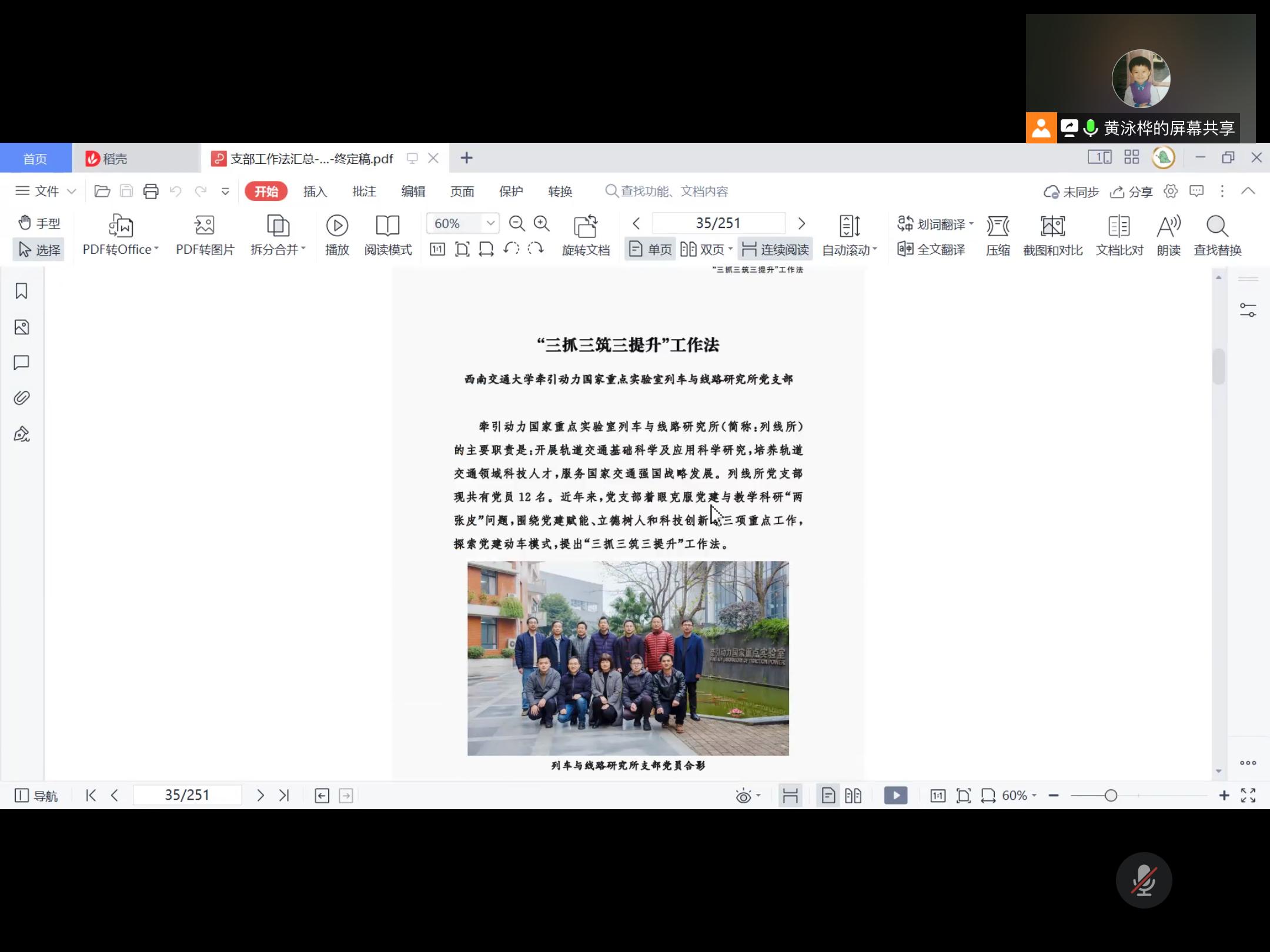 黄泳桦同志选取了“三抓三筑三提升”工作法进行具体介绍,“三抓三筑三提升”工作法以抓支部规范化建设、抓师德师风建设、抓科研文化建设为切入点,通过筑牢战斗堡垒以提升支部政治活力、筑实育人平台以提升人才培养质量、筑建创新争先文化以提升科研成果质量,实现党建和教学科研工作深度融合、同向同行。