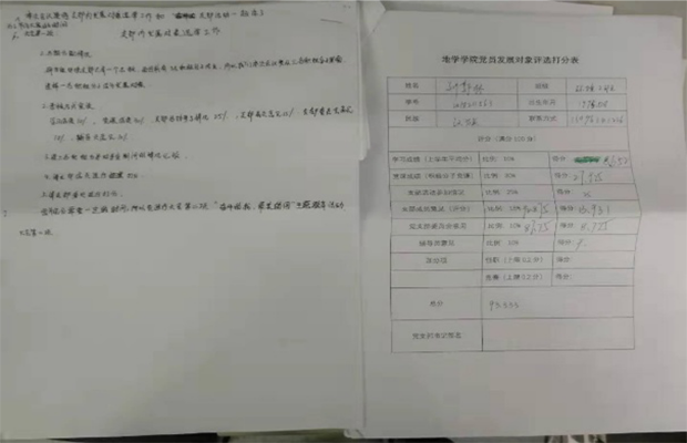 然后由三个党支部全体党员同志打分,之后严格按照上级相关评选细则评选,最后综合评选出本次发展对象名单,由胡代燕同志当场宣布(刘郭林)。