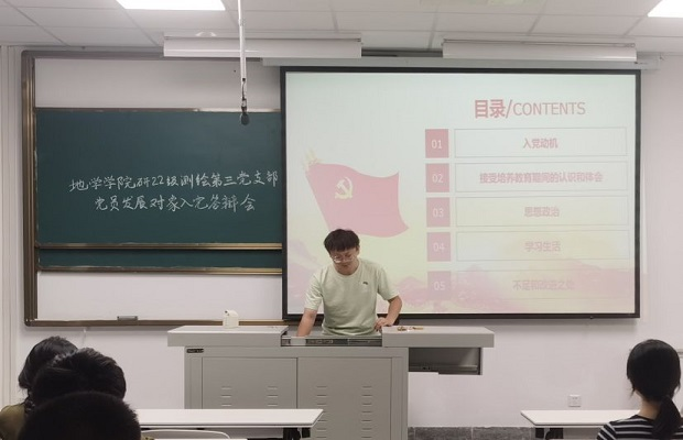 接着由邓江渝同志上台进行发展对象答辩。邓江渝同志分别从入党动机、接受培养教育期间的认识和体会、思想政治、学习生活、不足和改进之处等五个维度进行了充分汇报。汇报过程中,邓江渝同志表达了积极与党员同志沟通和学习的意愿,结合自身的学术热情,希望能为祖国科研事业贡献自己的力量。