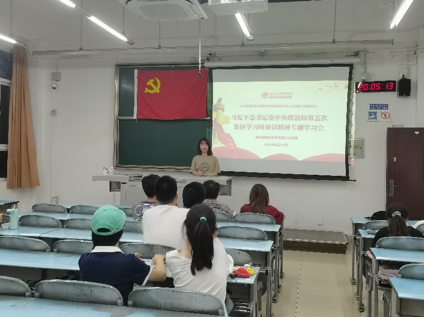 为学习贯彻习近平总书记在中共中央政治局第五次集体学习时的重要讲话精神,深化全体党支部成员对习近平新时代中国特色社会主义思想的认识,提升支部全体同志的思想政治理论水平,本科环境第三党支部于6月14日晚上19:50在X2227开展习近平总书记在中央政治局第五次集体学习时讲话精神专题学习会。本次活动由党支部书记钟若兰同志主持。