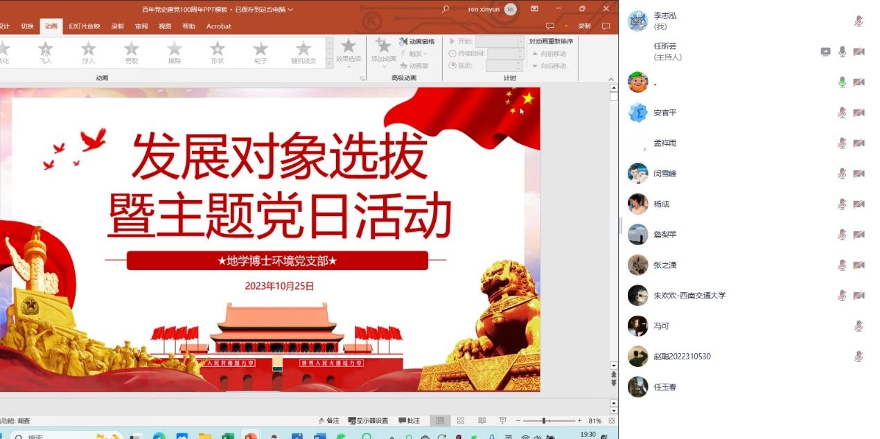 2023年10月25日19:30,地学博士环境党支部通过腾讯会议在线上顺利召开了发展对象选拔暨主题党日活动。本次会议由地学博士环境党支部书记任昕芸同志主持,共计14名正式党员、3名发展对象参加本次大会。