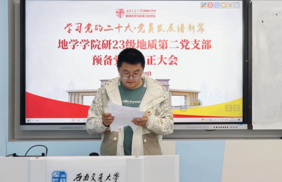 2023年12月8日,BEATS研23级地质第二党支部于J4205召开预备党员转正大会。本次转正大会由本支部书记黄丽敏同志主持。大会议程为:清点与会党员人数、申请转正的预备党员汇报自己在预备期间的综合表现、入党介绍人介绍预备党员的考察情况、支委会向支部汇报预备党员综合考察情况、正式党员采取无记名投票的方式对预备党员逐个表决、宣读支部大会决议以及预备党员转正时的表态等。
