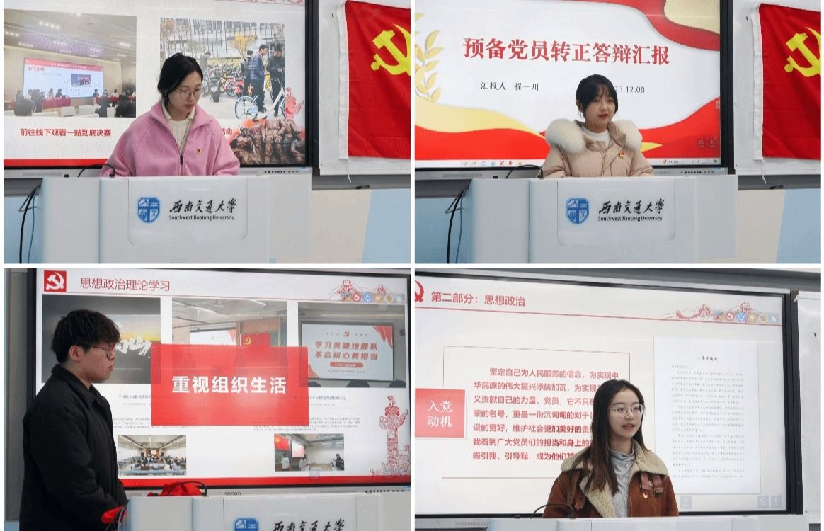 接着,申请转正的预备党员逐个汇报。陈瑞、程一川、李星泽、文雪洁四位同志从思想政治、理论学习、学习科研、群众基础、志愿服务和实践活动方面汇报了自己在预备期一年以来是如何以实际行动中向一名正式党员靠齐的,总结了进步,找出了不足,表达了迫切加入中国共产党的愿望。