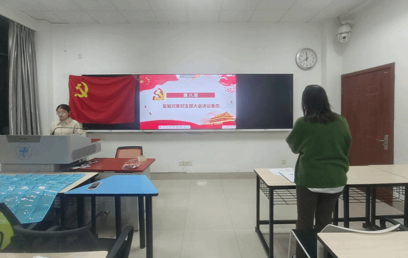 大会第七个环节,发展对象对支部大会决议表态。汪宇同志表示,今后在党组织的培养教育下,她将认真按照党员的标准去做,加强政治思想学习、对工作和学习精益求精。并且她会按时参加党组织生活,切实加强政治理论知识学习,提高理论水平和思想觉悟。