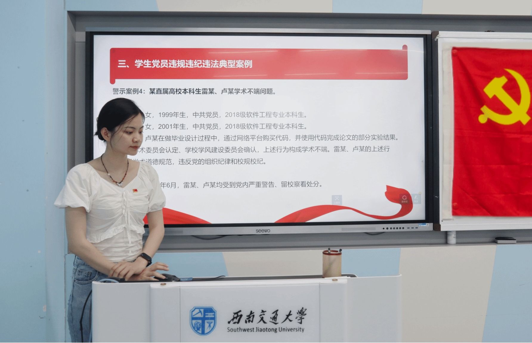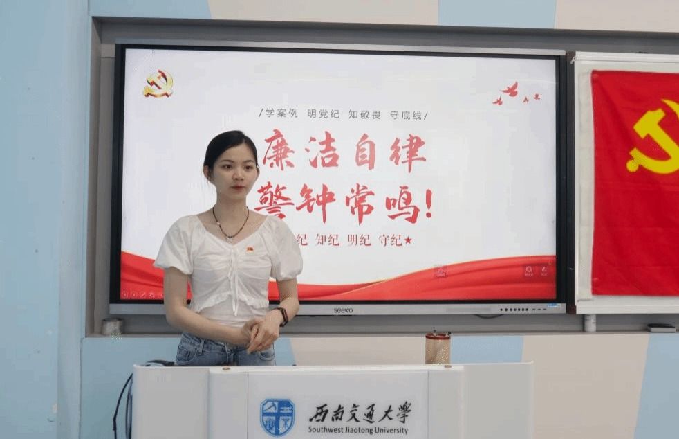为深入开展党纪学习教育,引导广大师生党员深刻领会党的纪律,强化纪律意识,加强自我约束,提高免疫力,增强政治定力、纪律定力、道德定力、抵腐定力,确保全体党员忠诚干净担当。2024年5月27日,研23级地质第二党支部在九里校区J4205教室举行“学案例、明党纪、知敬畏、守底线”的专题学习员会,由党支部书记黄丽敏担任主讲人,支部全体成员积极参与。