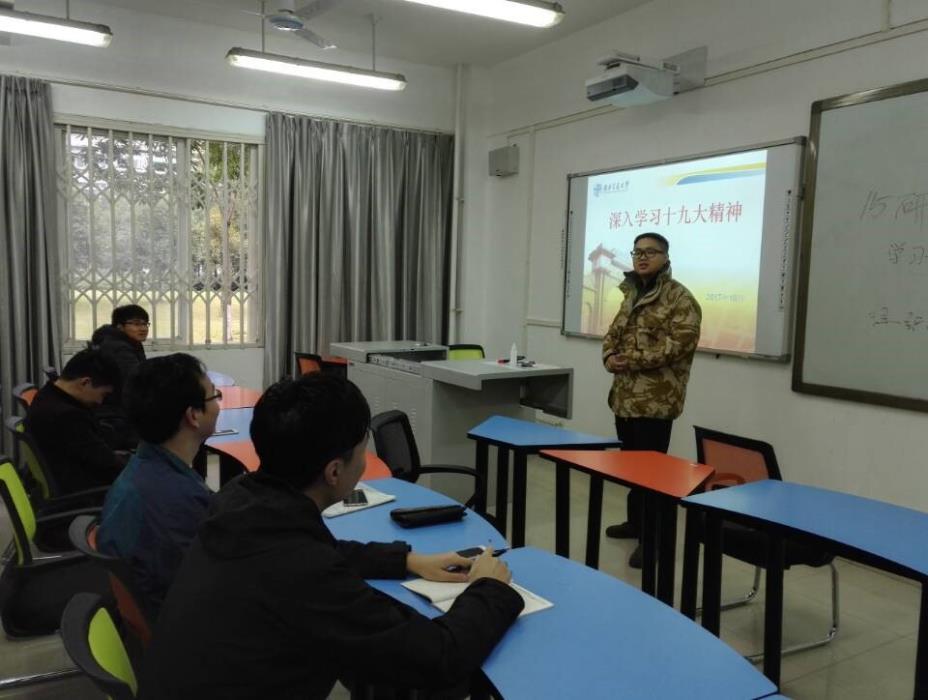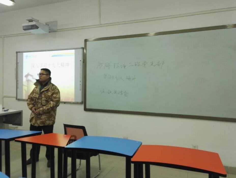 2017年1112日星期日下午,研2015级环境2班党支部开展的学习十九大精神专题学习活动在X2103B教室进行。支部同志们认真研读了党的十九大报告和党章,深入领会把握党的十九大精神。活动进一步加深了各位党员对习近平新时代中国特色社会主义思想为行动指南,把个人的理想追求融入国家和民族的事业中的认识。活动由支部书记陈豪宇主持。