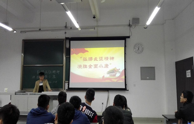 本次活动由测绘一班支部书记朱洪明主持,各支部同志、班级入党积极分子都积极参与其中。“弘扬长征精神,决胜全面小康”专题活动主要包括长征的历史背景介绍,以及长征精神的学习和弘扬两个部分。
