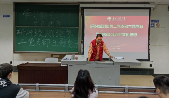 2024年11月15晚上,研24级测绘第二党支部在J4319教室,开展了以“学习领会习近平文化思想”为主题的党日活动。本次活动旨在深入学习和贯彻习近平新时代中国特色社会主义思想,特别是习近平总书记关于文化建设的重要论述,进一步增强党支部成员的文化自信和精神力量。