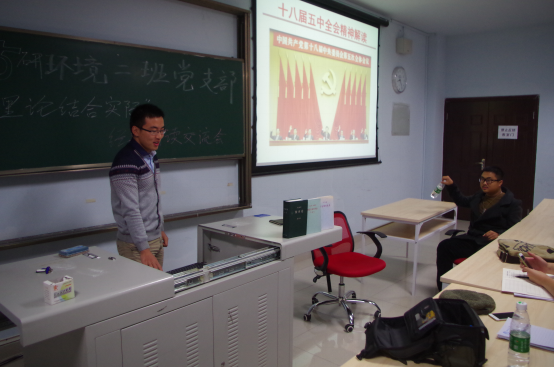 然后由卢晓辉同志介绍其读书心得和体会,其主要关注的现实事件是十八届五中全会,他首先介绍了十八届五中全会的内容,例如全会提出,坚持绿色发展,必须坚持节约资源和保护环境的基本国策,坚持可持续发展,坚定走生产发展、生活富裕、生态良好的文明发展道路,加快建设资源节约型、环境友好型社会,形成人与自然和谐发展现代化建设新格局,推进美丽中国建设,为全球生态安全作出新贡献。卢晓辉同志向支部同志解释大会各要点所体现的我党治国理政的理念,以及其中所包含的原理以及意义。