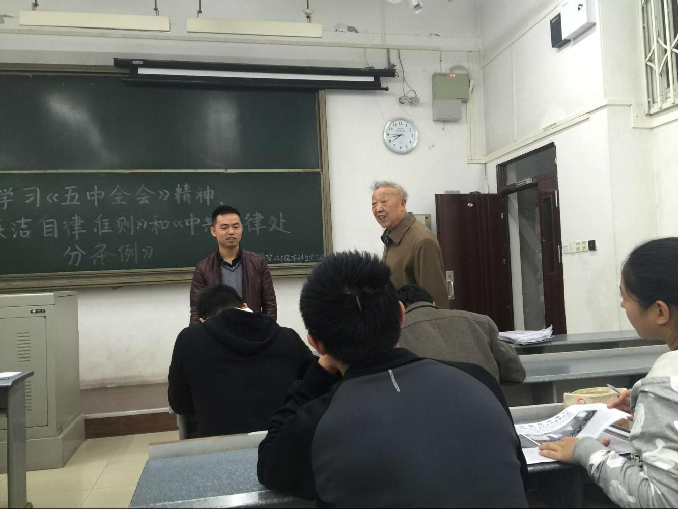 为了让同学们更加了解共产党的政策方针、清正廉洁的重要性及严守纪律的必要性,提高同学们的入党积极性,加深对党执政的认识并培养一名先进共产党员应具备的优秀品质,发挥优秀党员的先锋模范作用。2015年11月10日晚7:00,2015级本科生党支部成员在X7101召开“懂规矩,守纪律”主题活动——学习十八届五中全会精神、《中国共产党廉洁自律准则》和《中国共产党纪律处分条例》。会议邀请到了组织员刘冠军老师,党支部书记孙彦文老师主持会议。
