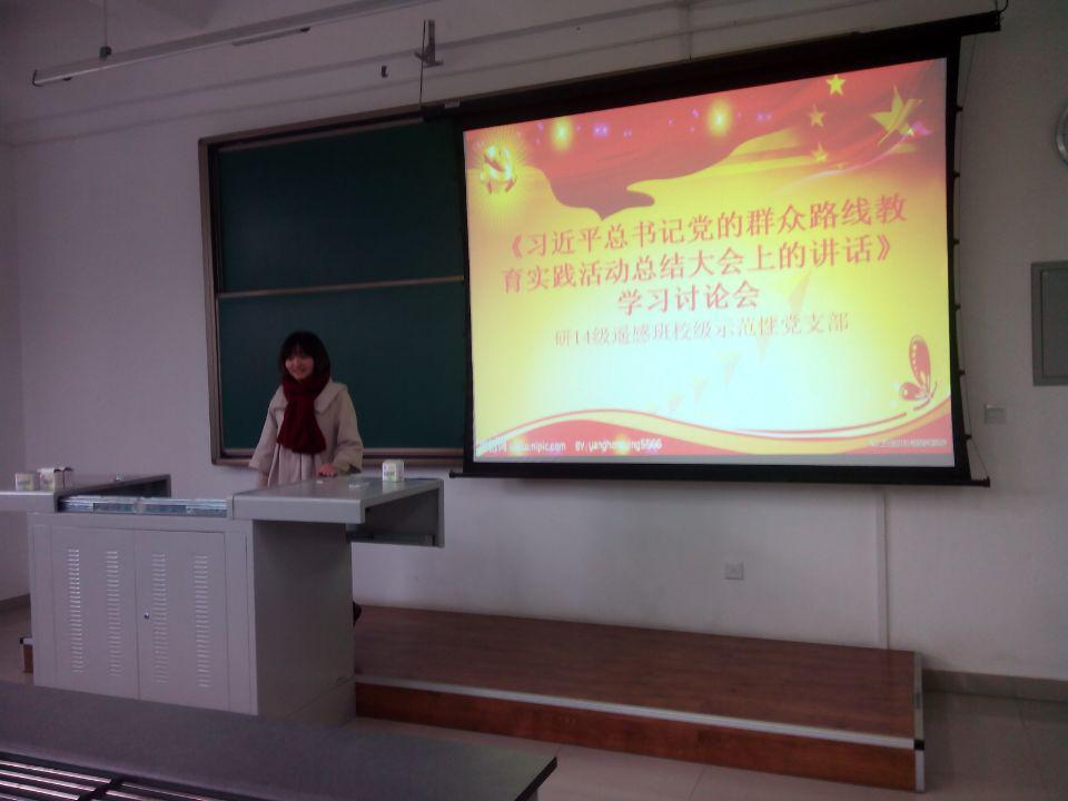 研14级遥感班校级示范性党支部分别于2014年11月27日、12月6日、12月18日举行十八届四中全会学习讨论会、《习近平总书记党的群众路线教育实践活动总结大会上的讲话》学习讨论会以及“慵懒散浮拖”专项整治讨论会。此次专题交流活动吸引三十余名同学参与其中。