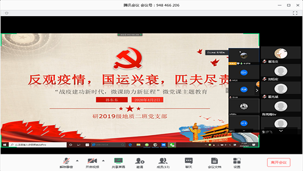 为深入学习贯彻“抓好疫情防控不放松,抓好各项重要工作不懈怠”精神,BEATS研19级地质二班党支部于2020年4月2日21点整开展“战役建功新时代,微课助理新征程”微党课主题教育。