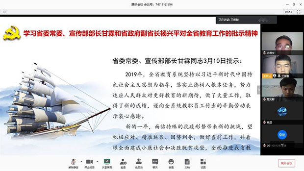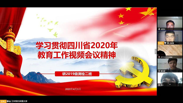 3 月 27 日,四川省教育工作视频会议在成都召开。会议传达了四川省委常委、宣传部部长甘霖同志,副省长杨兴平同志有关批示精神,并就2020年四川省教育工作作出全面部署。为深入贯彻学习本次会议传达的各项讲话精神,4月1日晚7点,BEATS研19级测绘2班党支部召开支部大会,大会宣读了省委常委、宣传部部长甘霖同志和省政府副省长杨兴平同志对全省教育工作的批示精神,学习了省委教育工委书记,教育厅党组书记,厅长李江同志以及省委教育工委副书记李光华同志的讲话精神。会议利用腾讯会议平台在线召开,由党支部书记王所智同志主持。