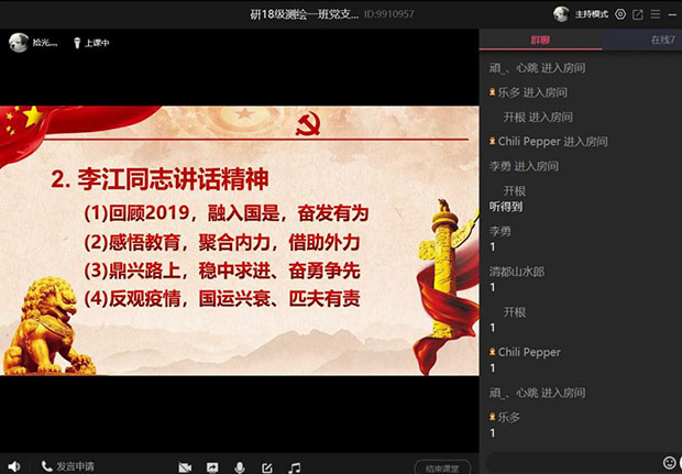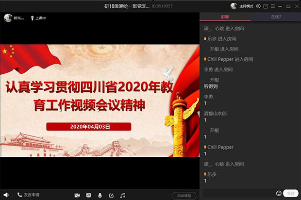 2020年4月3日,BEATS研18级测绘一班党支部学习关于3月27日四川省教育工作视频会议精神。受疫情影响,此次学习于线上进行,以视频会议形式召开,由党支部书记谢奇材同志主持。