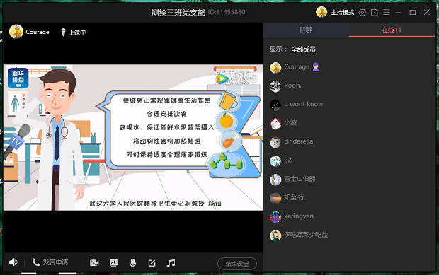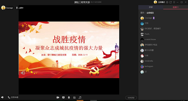 2020年3月11日晚上19:30,研17测绘三班党支部以QQ群课堂为平台开展了“凝聚众志成城抗疫情的强大力量”主题云上组织生活会。党支部共有党员13人,参加会议党员11人,会议由支部书记李炯卫主持。