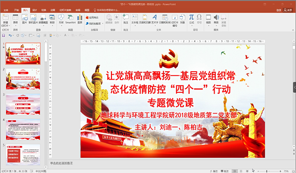 接着,由陈柏吉同志阐述此次微党课的第一个主题:让党旗在防控疫情斗争第一线高高飘扬。陈柏吉同志分为根究着实,力担使命以及同力协契,精诚互助两个方面阐述该主题,讲述了在疫情发生后习近平总书记马上做出指示,要把人民群众的生命安全和身体健康放在首位;全体党员要从自身做起,做好表率,做好疫情防控工作。刘迪一同志阐述本次微党课的第二个主题:让青春在党和人民最需要的地方绽放绚丽之花,刘迪一同志按照时间顺序,回顾往昔先辈的热血青春—五四运动,到今朝党员“90后”甚至“00后”医护人员勇当“逆行者”,奋斗在疫情防控第一线,最后展望未来,祖国新一代的青年应该树立远大理想,勇担历史使命,不忘初心,牢记使命,在实现中华民族伟大复兴的中国梦中不懈奋斗,书写青春灿烂的人生华章。