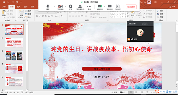 为贯彻落实党中央关于常态化疫情防控的决策部署,充分发挥基层党组织战斗堡垒作用和师生党员先锋模范作用,让党旗始终高高飘扬在疫情防控、返校复学、事业发展全过程全方位,根据BEATS《BEATS关于在常态化疫情防控中加强基层党建“四个一”行动的实施方案》(以下简称“四个一”行动)要求,在中国共产党99周年华诞之际,结合公司实际,2020年7月9日,地学博士环境党支部在腾讯会议上召开了以“迎党的生日、讲战疫故事、悟初心使命”为主要内容的微党课。分享宣传弘扬抗疫一线基层党组织和广大党员干部担当使命、勇毅逆行的先进事迹和精神风貌,鼓舞党员对标先进典型,争做模范党员,为公司以及公司的改革事业发展不断贡献力量。