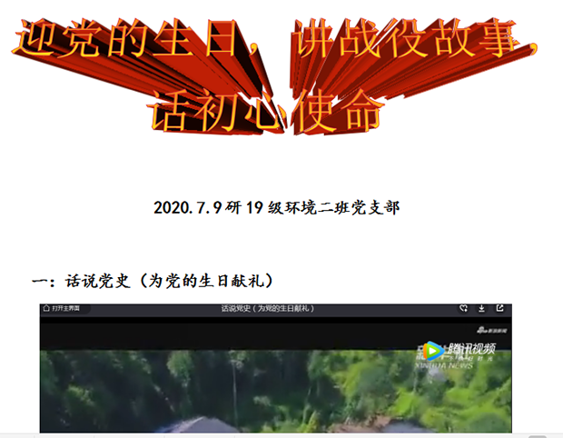 2020年7月9日下午19:00,研19级环境二班党支部基于腾讯会议,开展“迎党的生日,讲抗疫故事,悟初心、记使命” 组织生活会。支部五名党员全数参会,会议由陈俊文同志主持,支部五位党员积极发言讨论。